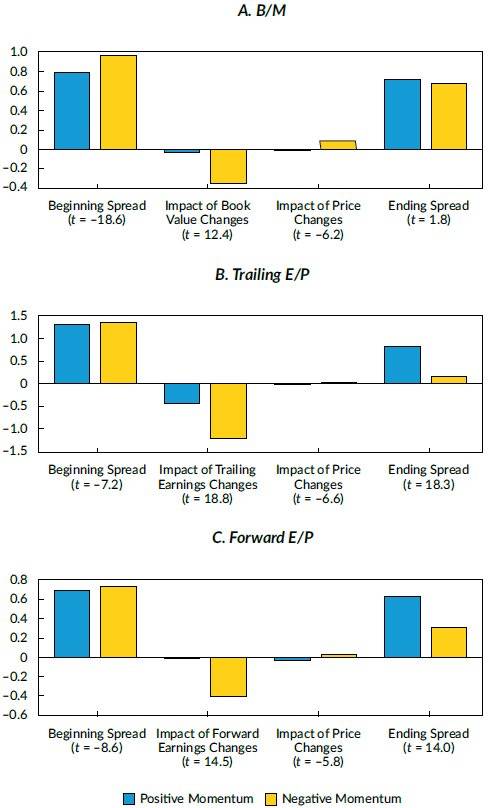 作者按正负动量进行分组,发现正动量组的会计指标变化远小于低动量组。对于远期收益/价格(Forward E/P)指标的正动量组,甚至出现【价格变动】成为价值指标均值回归效应的主要驱动因素。