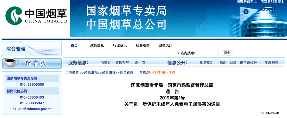 今天下午(11月1日),国家烟草专卖局、国家市场监督管理总局发布《关于进一步保护未成年人免受电子烟侵害的通告》称: