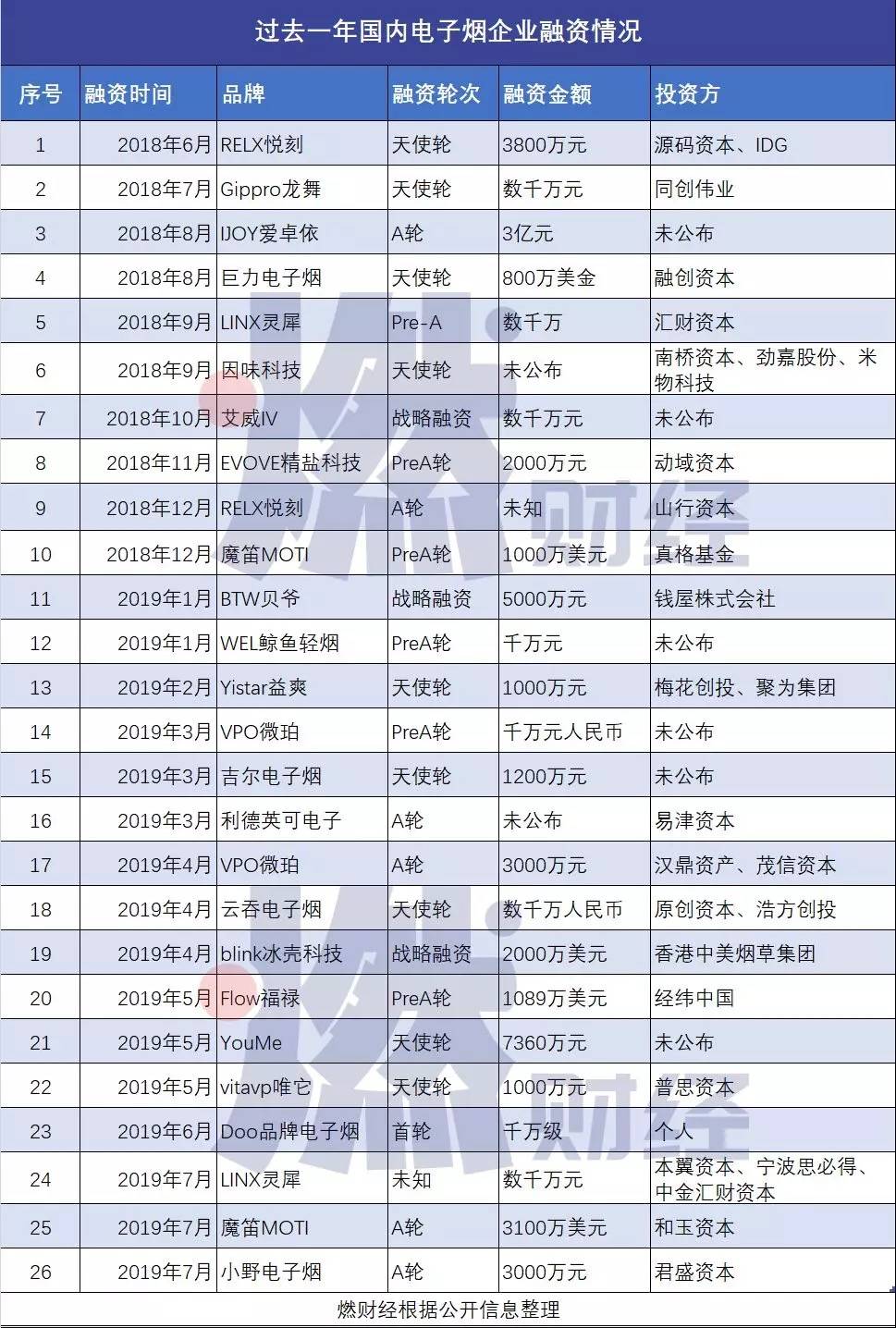 这样一个低门槛,高收益的行业,资本自然也闻风而动。以2018年6月悦刻拿到IDG和源码资本3800万投资为标志,此后一年资本开启狂热的“炒电子烟风潮”。