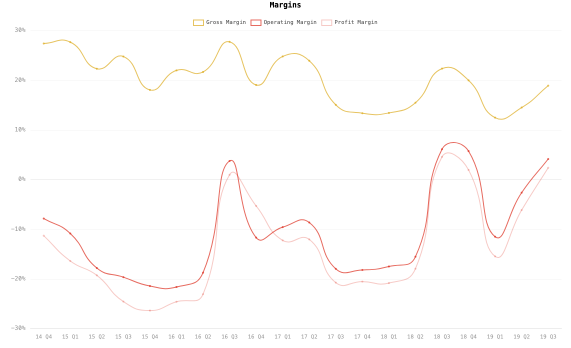 (特斯拉毛利润,经营利润,净利润波动,在每个车型面临量产之前都需要巨额资本投入)