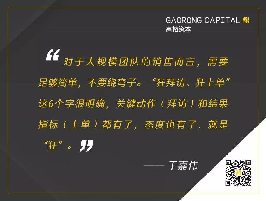 对于大规模团队的销售而言,需要足够简单,不要绕弯子。“狂拜访、狂上单”这6个字很明确,关键动作(拜访)和结果指标(上单)都有了,态度也有了,就是“狂”。“狂”这个字很有画面感,玩命、拼命、猛,都不如“狂”。