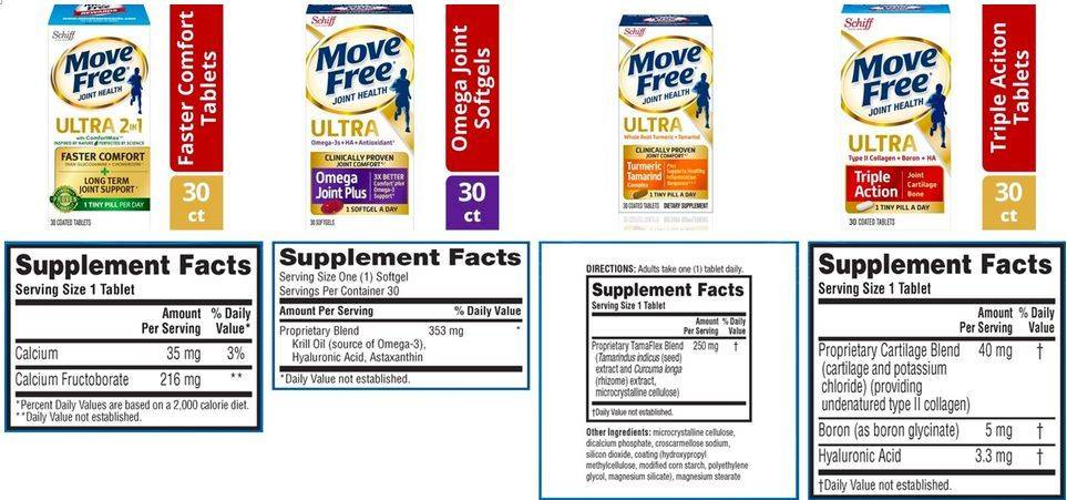 图:现有的4种Move Free Ultra系列产品的成分 (来自美国官网)。