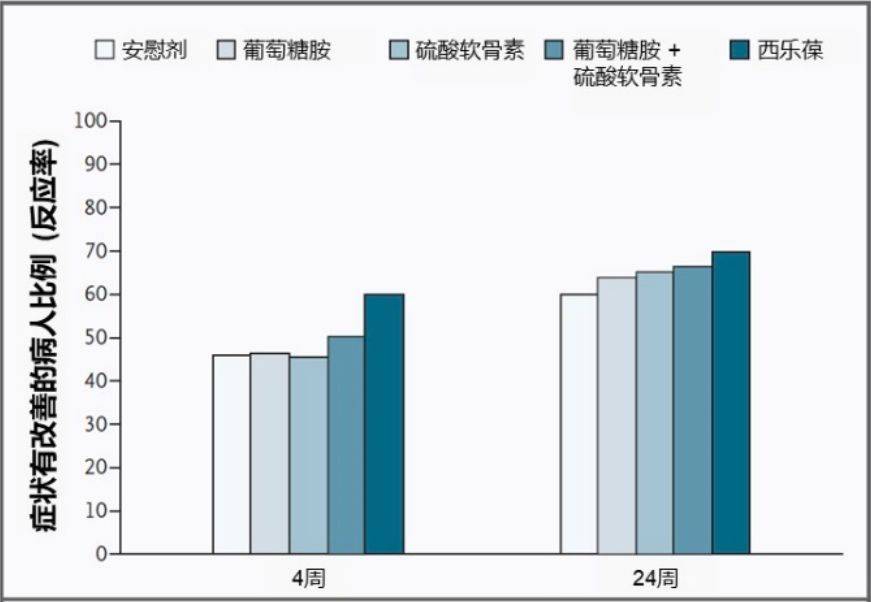 与安慰剂相比,葡萄糖胺、硫酸软骨素或者两者的联合治疗都没有显著减少关节间隙宽度的损失(关节炎没有减轻)。