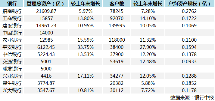 从管理总资产规模来看,12家银行之中,管理总资产在1万亿元以上的有5家,分别为招行、工行、农行、中行和建行;超突破5000亿元的有4家,分别为交通银行、中信银行、平安银行、浦发银行。