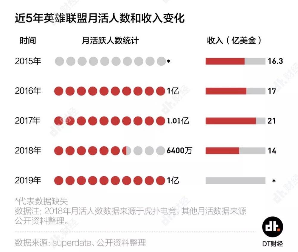 根据官方公布的月活数据,2016年~2017年LOL的月活跃用户长期稳定在1亿。虽然对于一款游戏来说,1亿月活已经不可思议。但停滞的增长率仍然正在透露着这款游戏由盛转衰的开始。