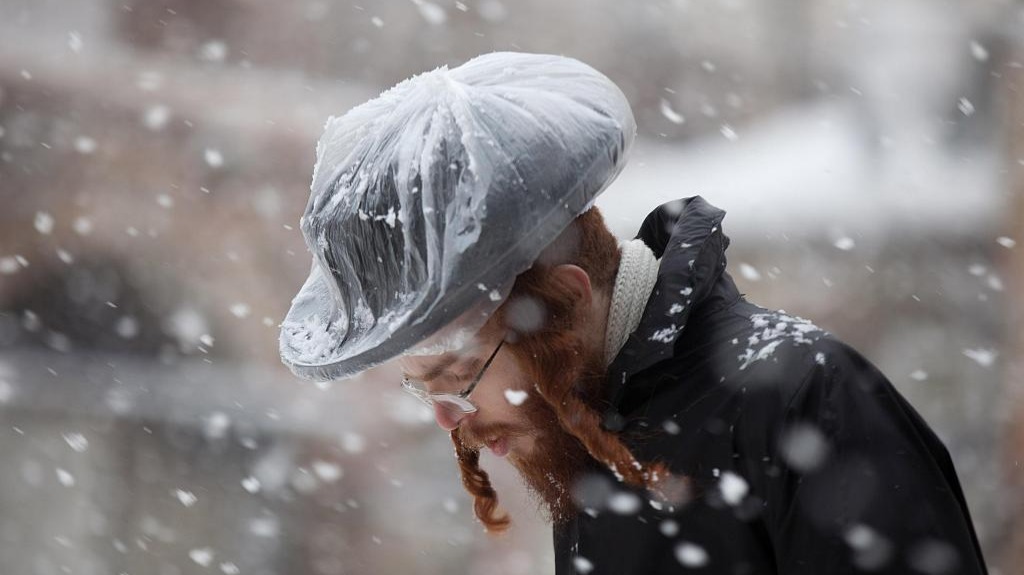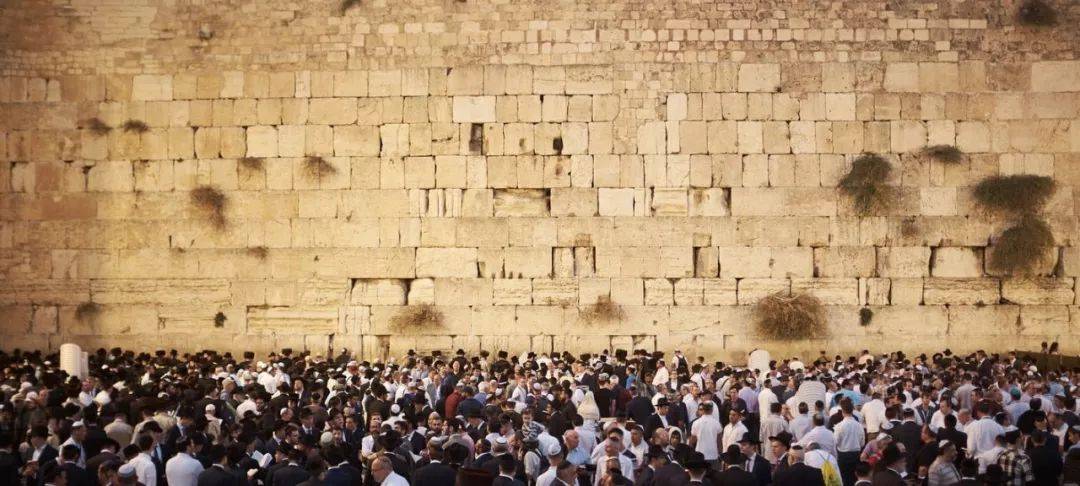 犹太男子们着西装戴高帽低头面向哭墙,圆顶清真寺仍然在城市的全景中散发着柔和的光。