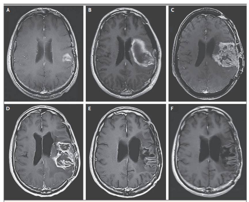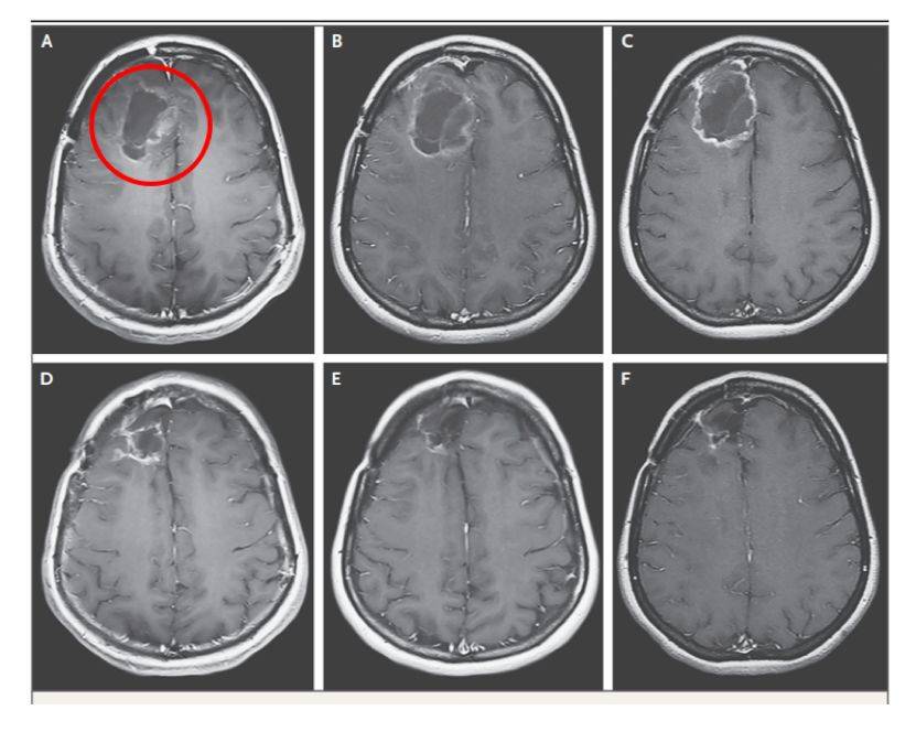 大家可以明显看出,治疗前,患者肿瘤已复发,有一个非常明显的脑瘤(图A),使用溶瘤病毒后,肿瘤慢慢地缩小,而且随着时间推移,效果越来越好,肿瘤没有复发迹象。5年以后再次做大脑扫描,发现肿瘤已经完全消失了(图F)!