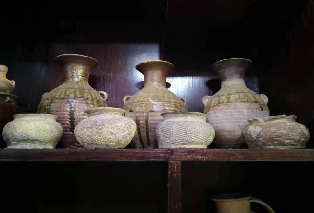 看着这些陶罐上清晰的回字纹,简单的陶器却在模仿高冷的青铜器纹样;上面一排黄釉高颈的盘口壶,则是汉代常见的釉陶模样。好在这些并非什么珍贵文物,一件顶多值几百块,否则固城遗址将会千疮百孔了。