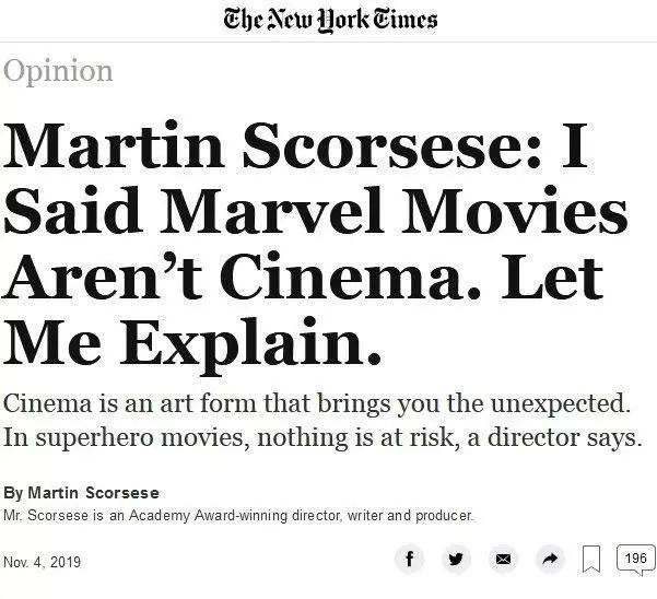 所以在朋友圈里看见大家转斯科塞斯在《纽约时报》上发表的文章时,纷纷表示没有去看过漫威,我隐约感到有些羞愧,我有啥问题?