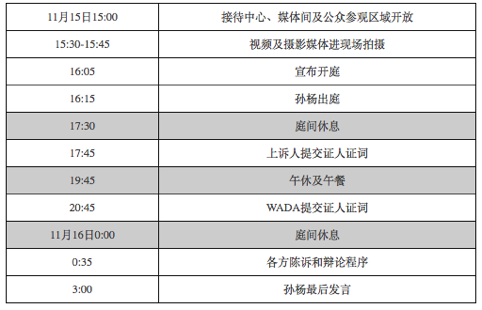CAS听证会时间历经三次变更。在WADA向CAS提起上诉后,听证会原本应在今年9月进行,但CAS称,“由于个人原因,一方已经请求延期举行听证会,其他各方同意并接受了这个要求”,听证会被延期,最早在10月底进行。最终确定的时间是在11月15日。
