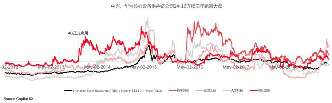 我们对4G时期的上市公司复盘可以看到,华为、中兴核心设备供应链公司在4G建设期间跑赢大盘,最大涨幅基本出现在发牌日前一年到发牌日第二年左右的主建设期内。在5G时代,基站配件同样属于基站建设的前周期产品,对新供应商来说,能否在5G前三年主建设期进入中兴、华为供应链十分重要。虽然供应商每年会重新投标,但可以看到华为5G时代新供应商较少,一方面是4G时代的供应商跟着华为享受到了增长红利,紧跟华为投入5G产品研发,另一方面也是与华为配合多年,各方面经过了华为严格的磨炼。