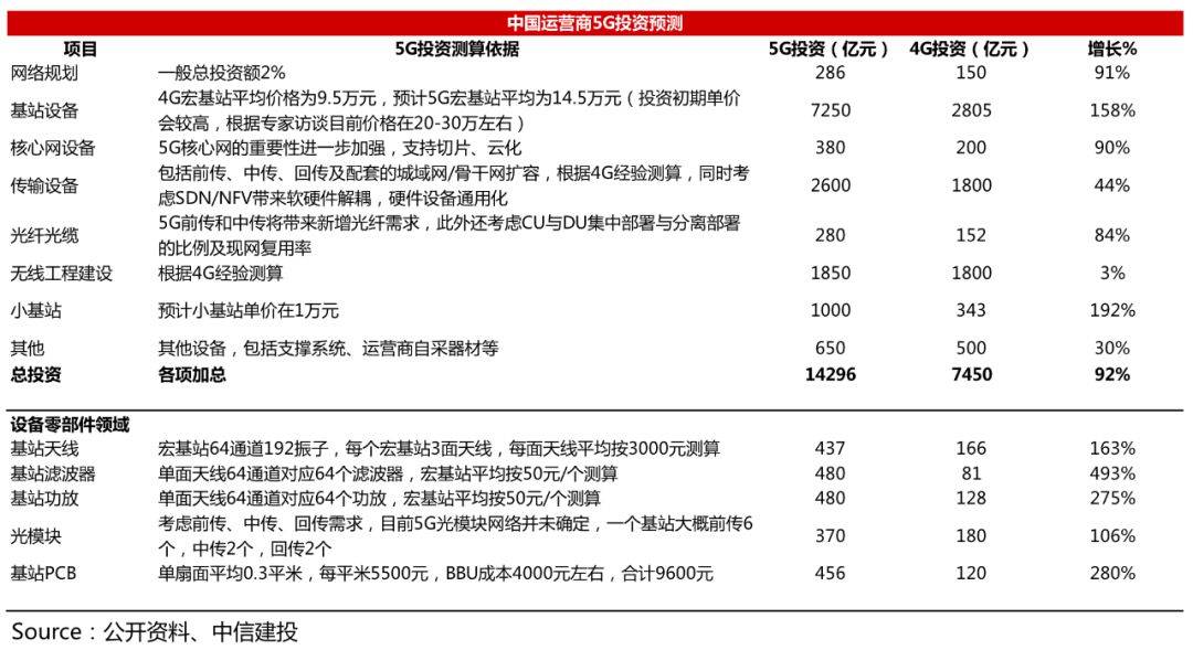 基于500万宏基站的建站数,我们预计5G的运营商投资将接近1.5万亿元,相比4G时期增长92%。
