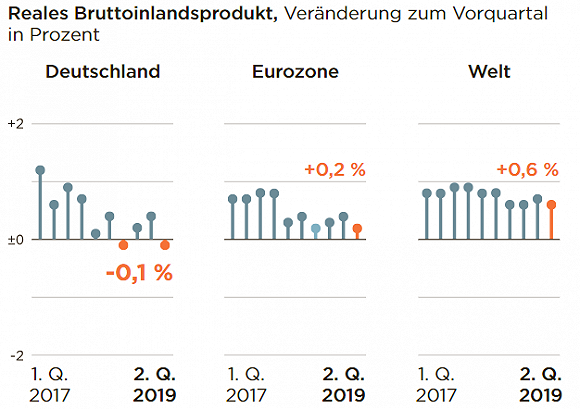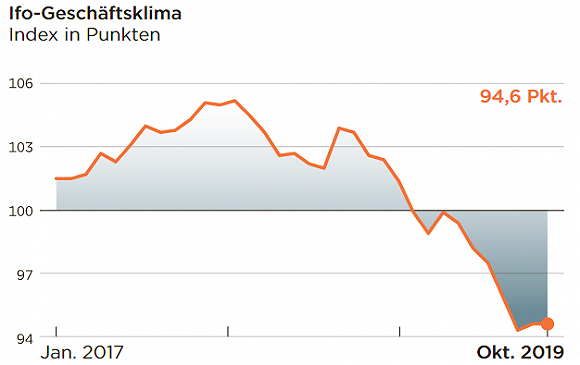 这一趋势也同样得到了德国政府的侧面确认。10月17日,经济部长阿尔特迈尔就将德国2020年的预计GDP增长率从4月预估的1.5%下调至1.0%:2019年全年的经济增长率也下调为0.5%,而今年年初的数字还是1.8%。
