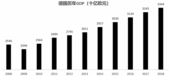2008年金融危机以来,以欧元计价的德国GDP在十年内从2.45万亿欧元一路上涨到3.34万亿欧元,相当于十年内经济规模增长了36.7%或平均每年增长3.2%。