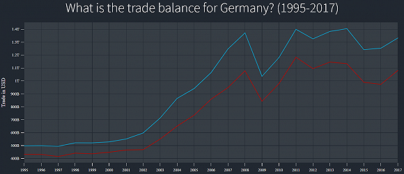 凭借着过硬的工业实力以及欧盟关税同盟市场,自从第三帝国覆灭以来德国就是世界吸金能力最强的贸易顺差国之一。根据ifo经济研究所的预计,2019年德国的贸易顺差将达到2760亿美元,相当于德国7.1%的全年GDP,在七国集团中连续多年稳居第一。