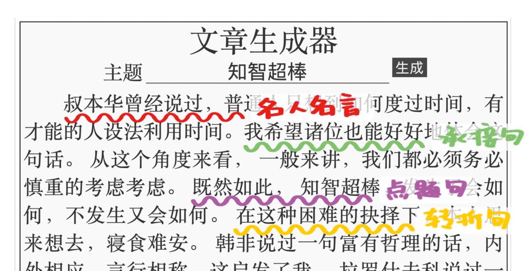 文章会从名人名言开始,接上没有实际意义的承接句,然后是点题句,再来个同样没有意义的转折句。然后再接名人名言、承接句、点题句……周而复始生生不息。
