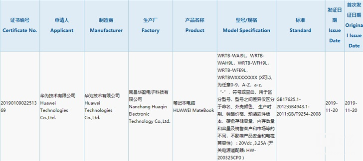 也是在今天,华为几款 MateBook 笔记本电脑新品通过 3C 认证。认证信息显示,新款华为MateBook 配备 65W 电源适配器,发证日期为 11 月 20 日,制造商和申请人均为华为技术有限公司。