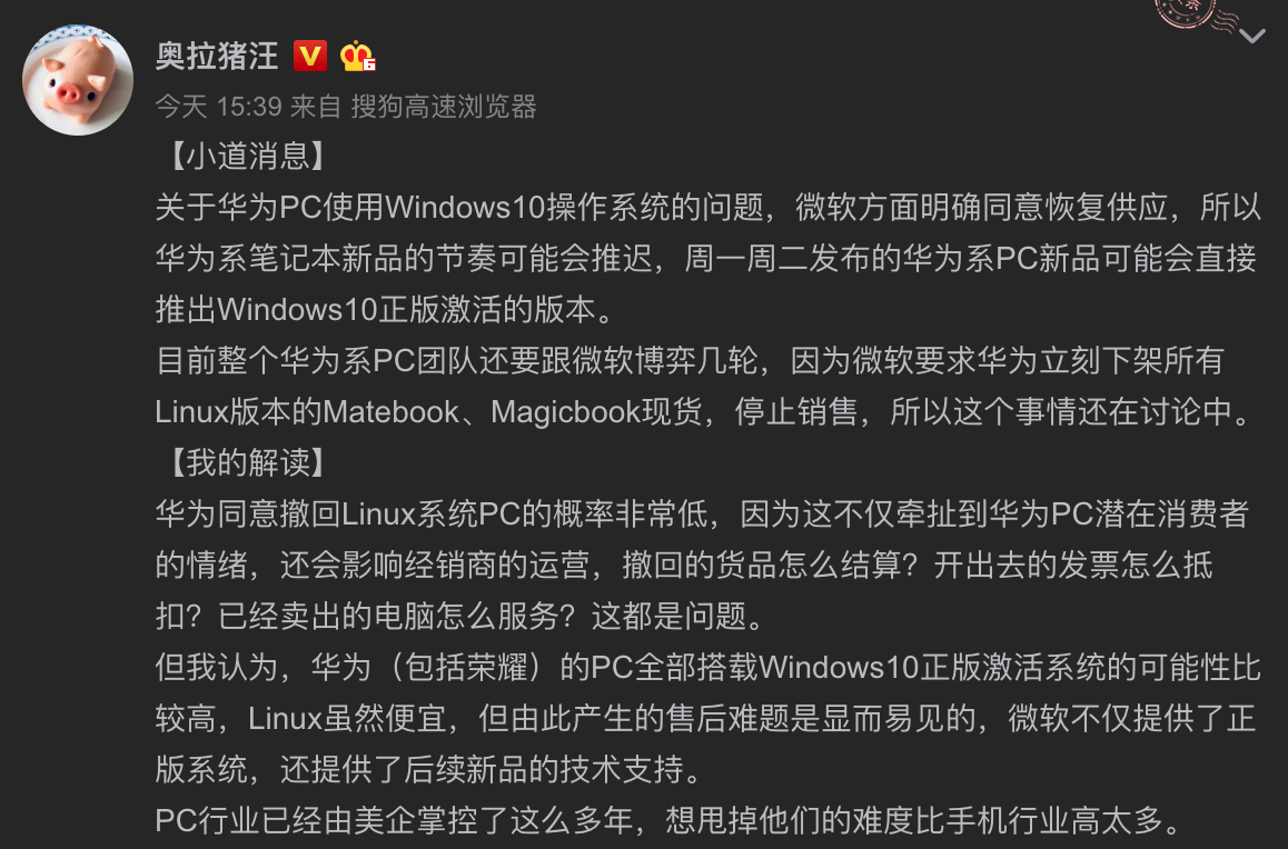 笔记本领域知名博主“奥拉猪汪”透露,微软明确同意恢复 Windows 10 系统的供应,华为于下周一周二发布的 PC 新品可能会直接推出 Windows 10正版激活的版本。