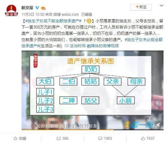 《新京报》一则热议新闻:父母辈在祖父母辈之前去世,独生子女并不能继承全额财产