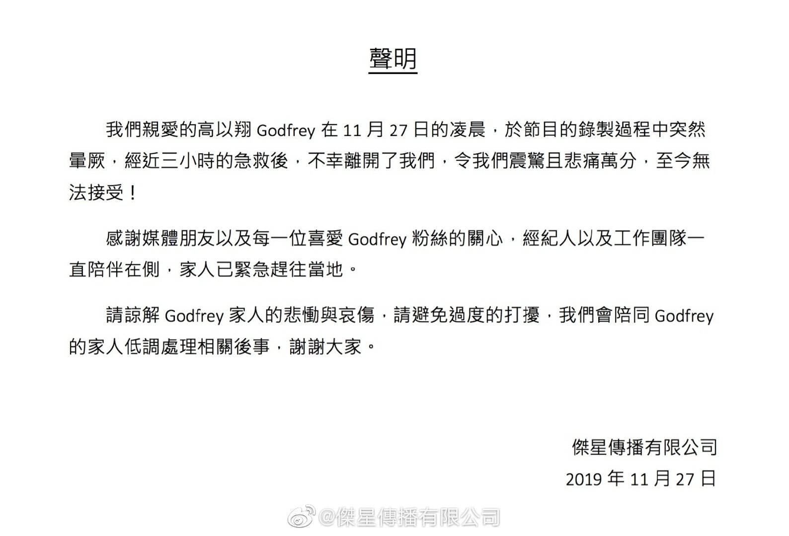 高以翔公司发声明称:经近三小时的急救后,(高以翔)不幸离开了我们,我们悲痛万分,至今无法接受。据称,高以翔遗体明日运回台北,女友也飞赴浙江。