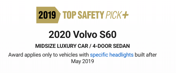 (2020款沃尔沃S60获得IIHS的Top Safety Pick+)