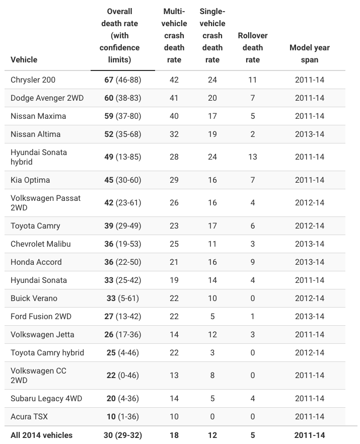 (IIHS关于车辆发生事故导致死亡比例的统计,图为2014年4座中型车统计表)