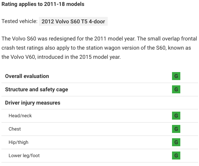 即便在采用最严厉碰撞测试的IIHS中(25%偏置碰撞测试被称为最严格测试),所有年份沃尔沃车型几乎全是最高评价Good,就算是在1994年测试的850/S70(当时仅有40%偏置碰撞)也拿到Good成绩。当2012年25%偏置碰撞首次加入测试后,首批测试车中包括宝马、奔驰、奥迪、沃尔沃、雷克萨斯、英菲尼迪、讴歌等一系列豪华品牌,然而结果只有沃尔沃S60和讴歌TL拿到了Good成绩。