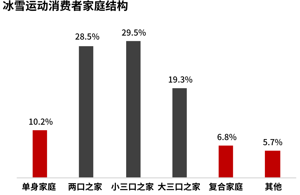年轻化,是冰雪运动人群最明显的特征。滑雪客群男性超过一半,以 24~35岁的中高消费群体为主。其次,家庭客群不容忽视,两口、三口之家占比超过一半。