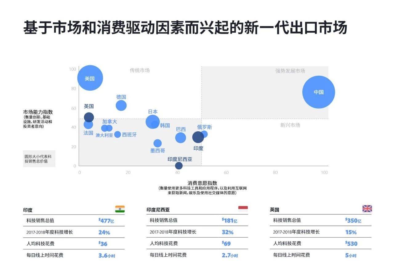 Facebook在本次发布的白皮书中,通过市场能力指数、科技销售总价值、消费意愿指数3个维度对新一代出口市场进行了解析,其中印度、印尼和英国是3个具有代表性的市场,陈晶在与Morketing的采访中对这三个市场的现状、主导科技增长的人本因素、未来的发展趋势、回报情况等方面分别做了不同的解读。