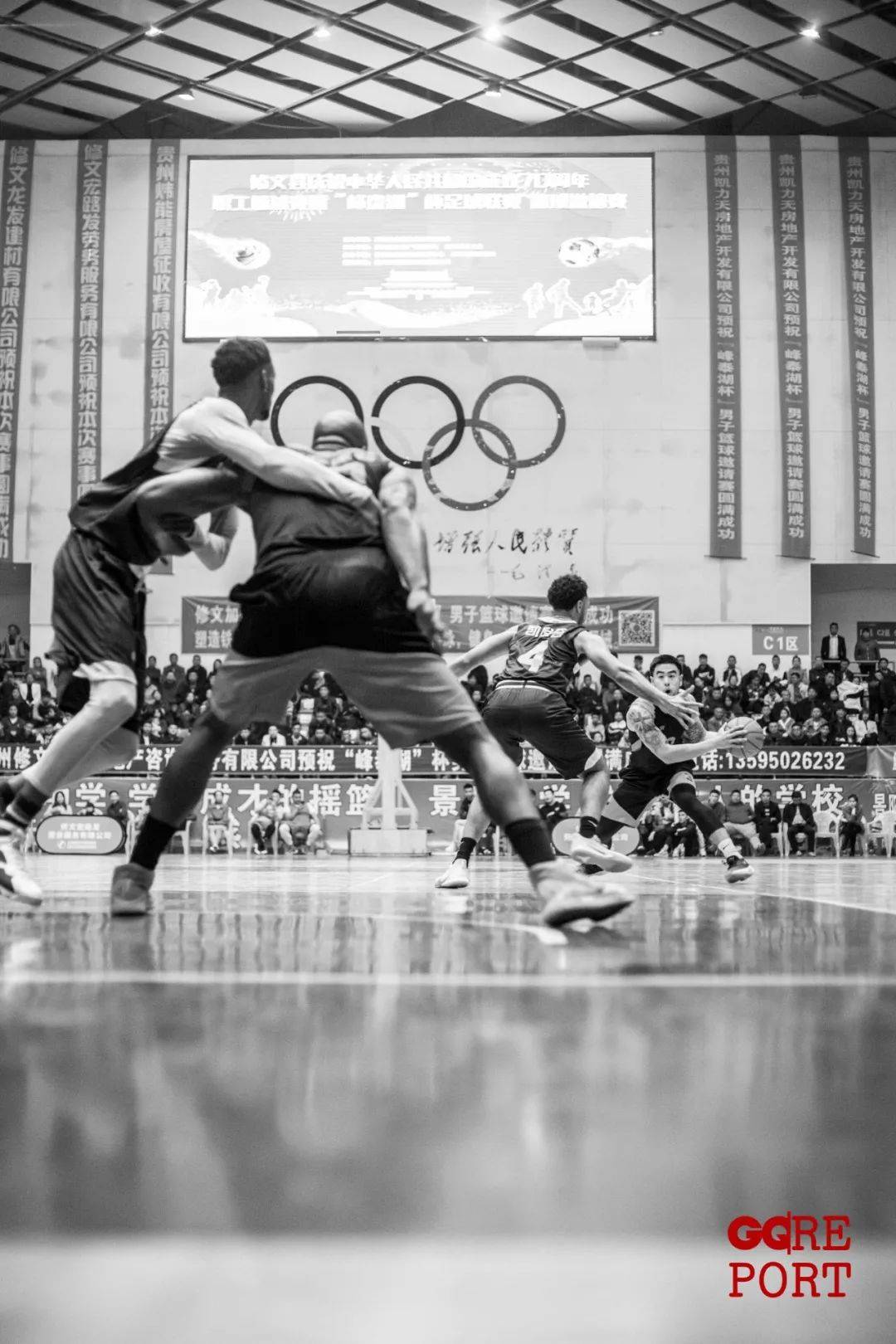 我们身处山西省平遥县的一座体育馆内。周围一切显示出一种混合的特色。两只球队中有中国人,也有高大的黑人、白人,有人体格如雕塑,有人的肚子顶着球衣。场馆四周挂满广告,“光大地产”、“上品土猪”和“范小姐的店”,交110块能出横幅,360块能占个好位置。挨近场地有一块蓝色横幅,上书“平遥监狱祝比赛圆满成功”。