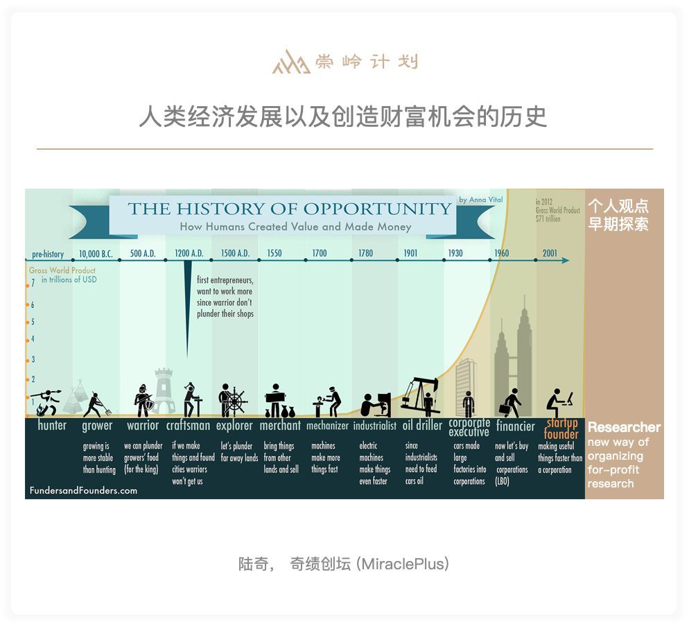 我个人很喜欢这张图,它的核心是说,在不同的历史阶段,在不同的技术能力情况下,人类哪一个行业是财富创造最多的。