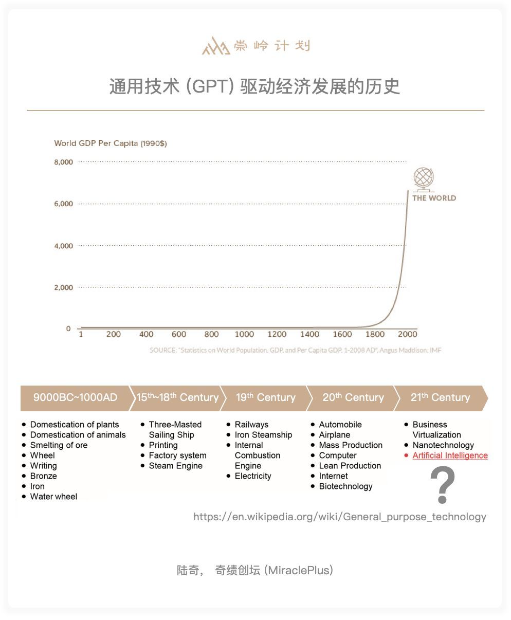 人类经济发展是由通用技术所驱动,这张图纵轴是人均GDP,横轴是通用技术的发展,从最早期开始,通用技术的发展十分缓慢,种植植物、驯化动物、使用金属等等,对经济的影响也很小,只有从工业革命开始,技术的通用性更强,才有了比较显著的提升,到了最近几十年,特别是过去60多年,经济曲线开始大幅度上升,因为有信息技术,特别是最近几年开始大规模发展的人工智能技术。我建议创业者们要关注什么样的通用技术在不断推进,这其中有哪些被商业化的可能。