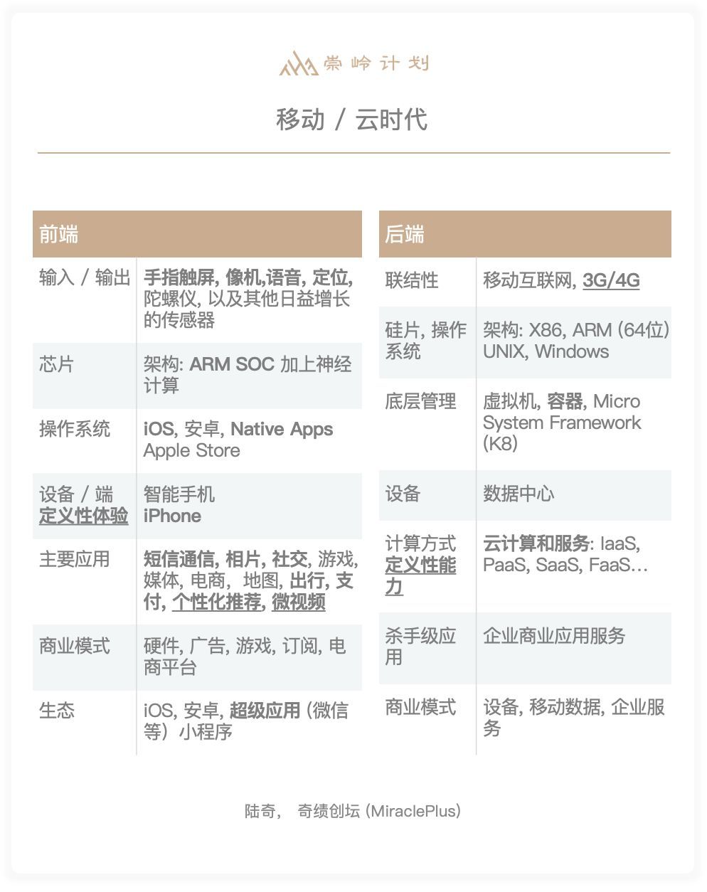 平台有前端和后端,前端是体验,后端是能力。前端基本由人机交互的效率和覆盖率驱动,过去很多年信息工业历史基本上由交互驱动,微软本质上是一个鼠标键盘公司,苹果本质上是一个手指公司,哪里有交互的突破哪里就有大规模的商业价值;后端基本由计算资源(计算,存储,通信)与信息处理的规模, 空间覆盖度驱动。
