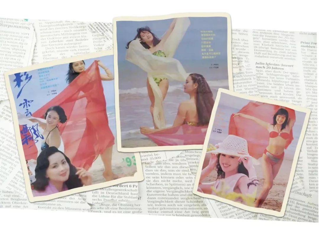 泳装大美女挂历实在暴利,就连当时世界销量第一的电影杂志《大众电影》也忍不住下海,拉着女明星们到海边拍了一组温软的泳装+丝巾主题的挂历,起名《彩云飘》。