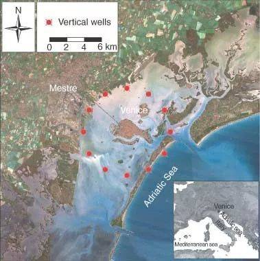 威尼斯泄湖卫星照片,图中红点即为甘博拉蒂建议的钻井与海水注入工程位置 | https://www.researchgate.net/