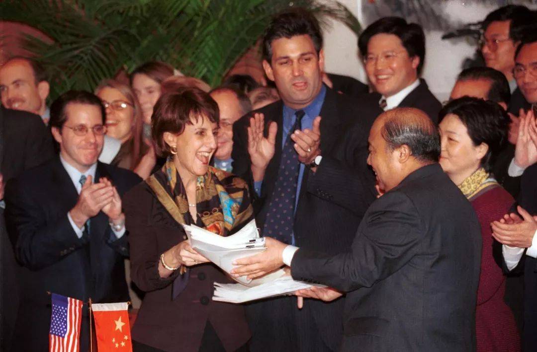 (中美就中国加入WTO达成协议的历史画面,中间左侧女士为美国贸易谈判代表巴尔舍夫斯基,右侧男士为中国外经贸部部长石广生,图片源自@视觉中国)