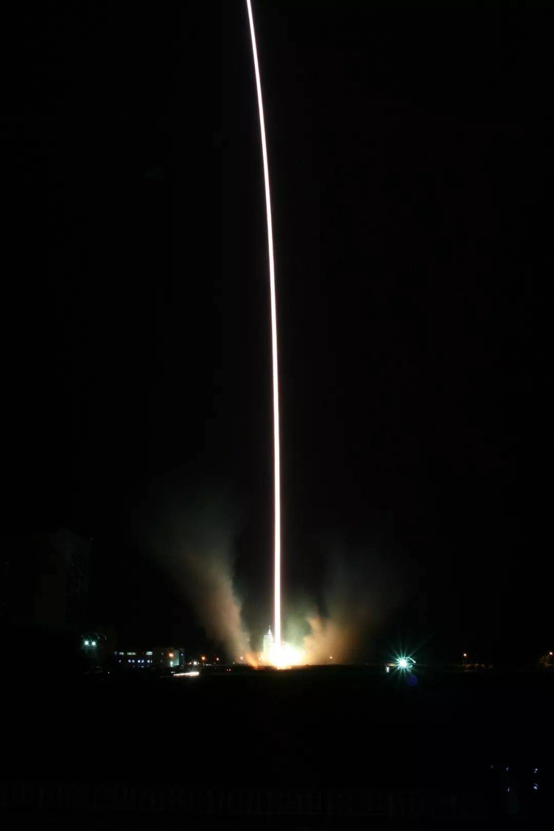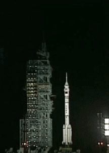 火箭搭载着,中国第一艘宇宙飞船,神舟一号试验飞船,绝尘而去,消失在夜空中。