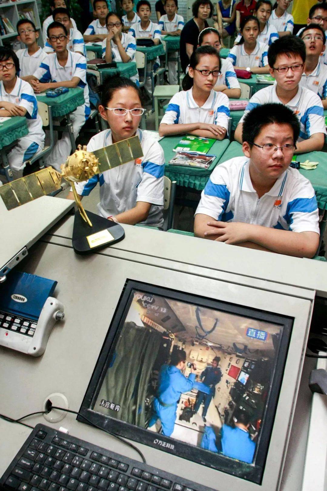 (2013年6月20日西安一所中学的学生正在观看“神舟十号”太空授课,图片源自@视觉中国)