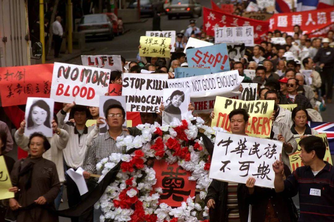 (1999年5月13日新西兰的华人,举着“中华民族不可欺”的牌子抗议轰炸,图片来源@视觉中国)