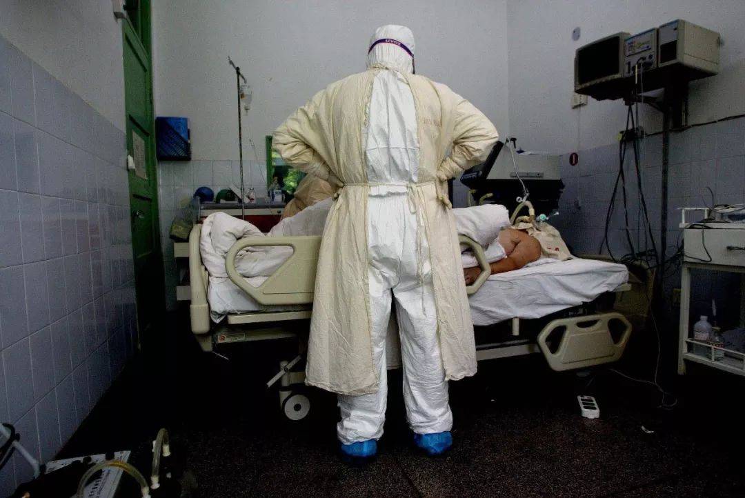 (2003年4月30日,一名患“非典”的重症病人抢救无效身亡,医生久久地站在他的遗体前,图片源自@视觉中国)