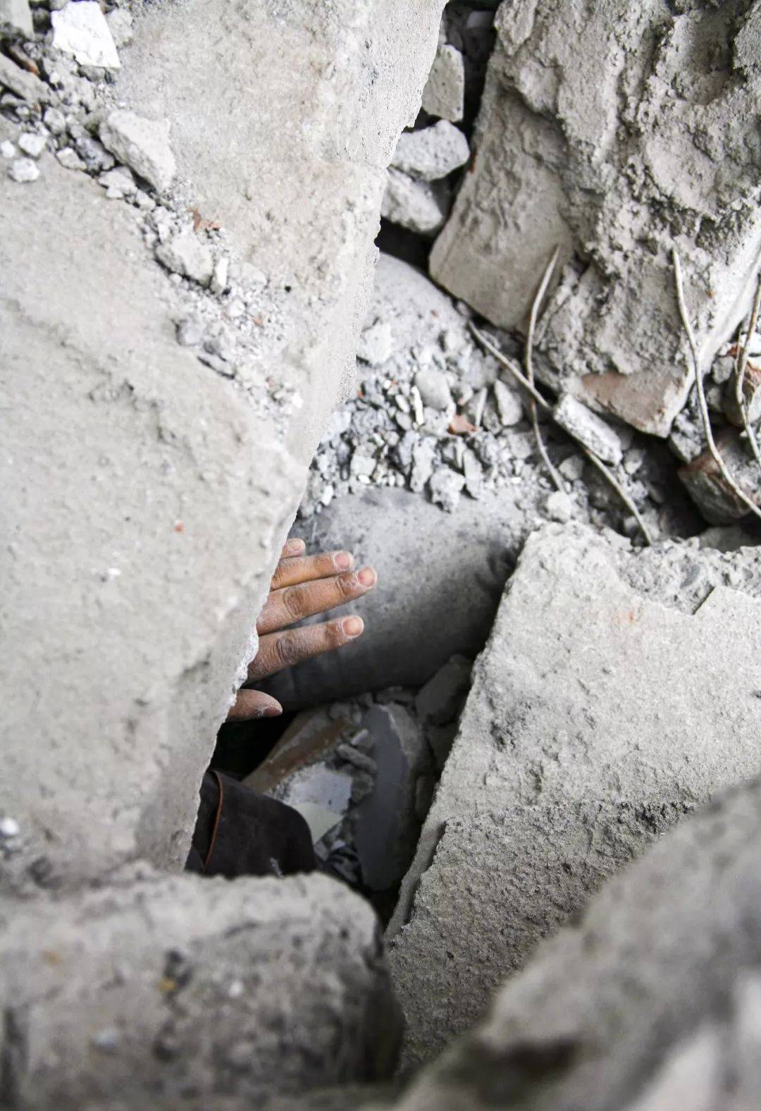(2008年5月13日,四川绵阳北川县,一名幸存者从一座倒塌建筑物的残骸中伸出手来,图片来源@视觉中国)