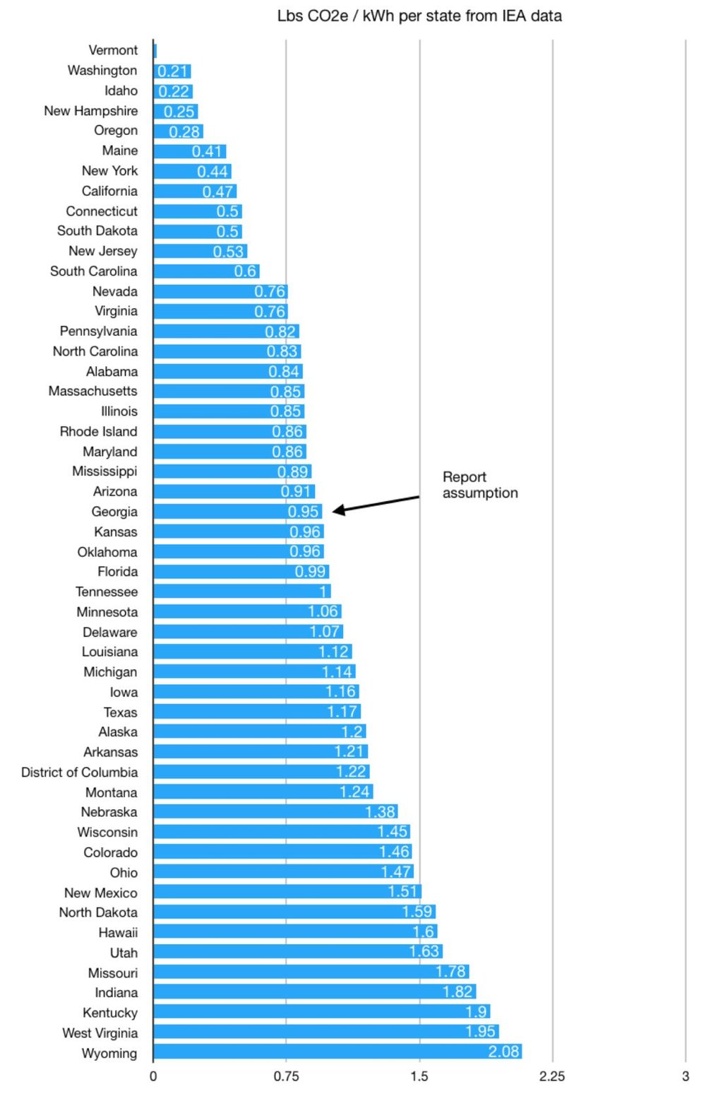 Michael的假设是,论文中的许多模型都以加州为基地,而来自加州电网的每千瓦时0.47磅二氧化碳当量仅为美国平均水平的50%。