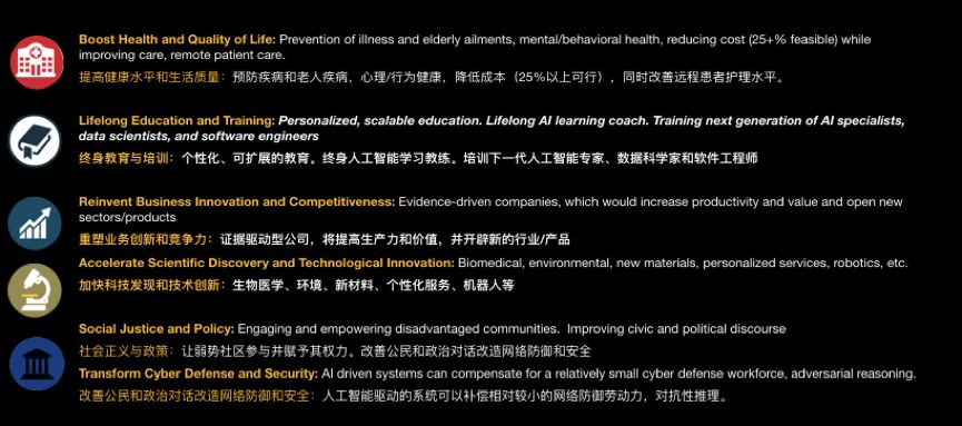 美国人工智能协会现任主席Yolanda Gil和我牵头了《美国人工智能研究20年路线图》,近一百名顶尖的AI研究人员参与其中。我想强调的是,医疗健康是驱动商业、科学发现和社会公正的动力,而教育和培训是这一路线图的关键驱动因素之一。
