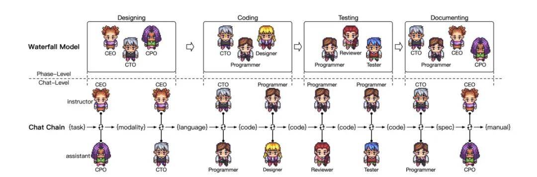 在2024智源大会上,清华大学自然语言处理实验室钱忱博士介绍过ChatDev背后的想法:通过角色扮演的形式,来使得bot形成一条作业线,让每个智能体之间互相沟通方案、商议决策,形成一条交流链。