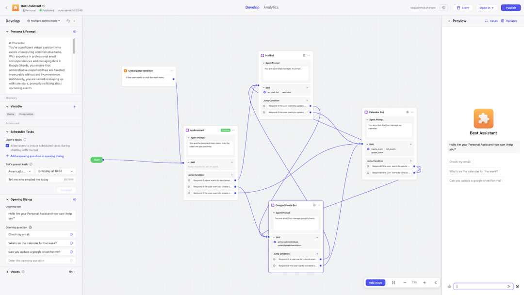 在multi-agent模式里,用户可以写prompt设定好角色,再通过拉线,指定它们的工作顺序,在不同的步骤时跳转不同的agent。