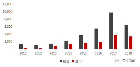 2011年~2018年中国区人民币和美元基金退出金额(人民币是美元的1.82倍)