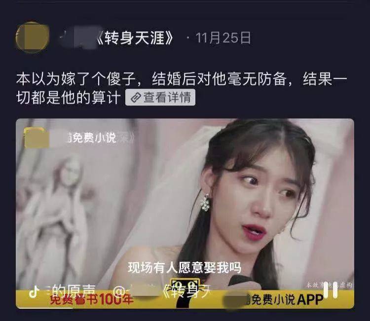 故事至此结束,一个短短几十秒的视频里,几乎把“总裁”系列小说里最常见的戏剧点提取而出。当商业联姻、豪门恩怨、家族纠纷、弄假成真等戏剧冲突感十足的元素齐聚一起,虽然让人看不清故事真相,却也成功勾起了观者的好奇心。