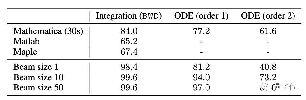 比如,在一阶微分方程中,与使用贪婪搜索解码算法(集束大小为1)的新模型相比,Mathematica不落下风,但新方法通常1秒以内就能解完方程,Mathematica的解题时间要长的多(限制时间30s,若超过30s则视作没有得到解)。