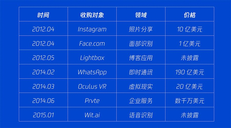 但在今天,我们所了解到的海外知名社交应用并不只是 Facebook 本身。而这,都得益于 Facebook 在 2012-2016 年间陆续完成的多项重大投资并购。