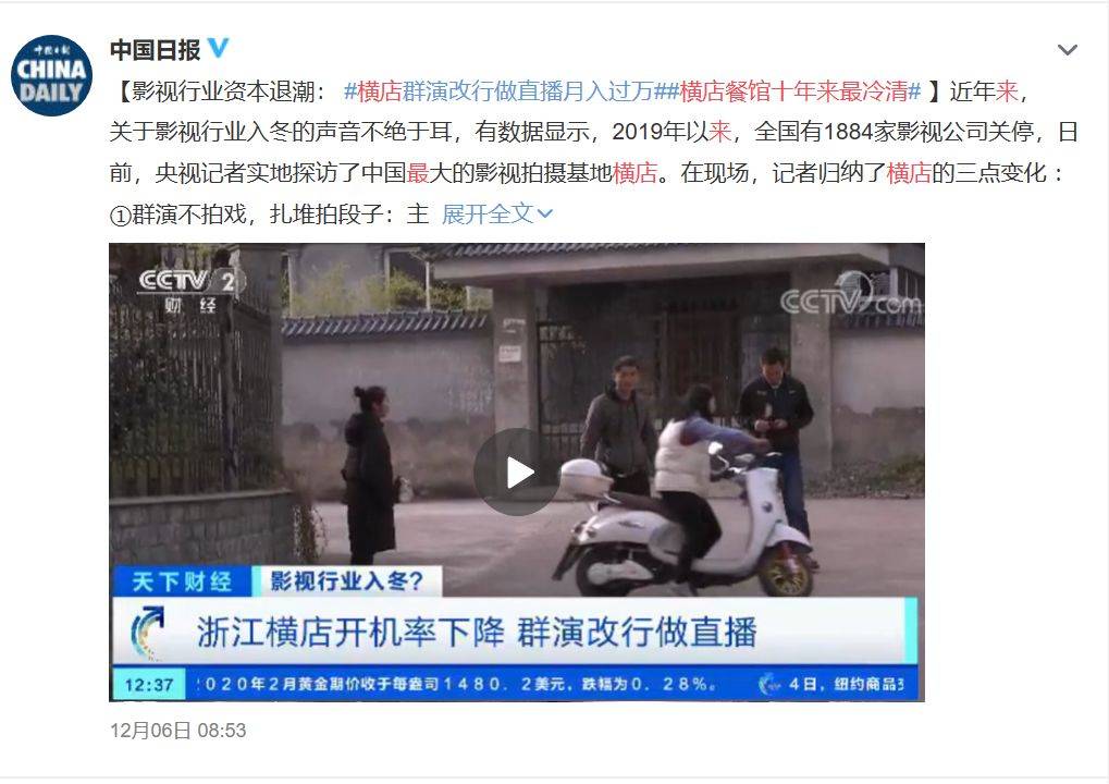 #横店影视城餐馆10年来最冷清##横店影视城免费开放摄影棚,年让利数亿元#……各种与之相关的讨论,飘在热门微博下方的评论区内,引吃瓜群众注目。